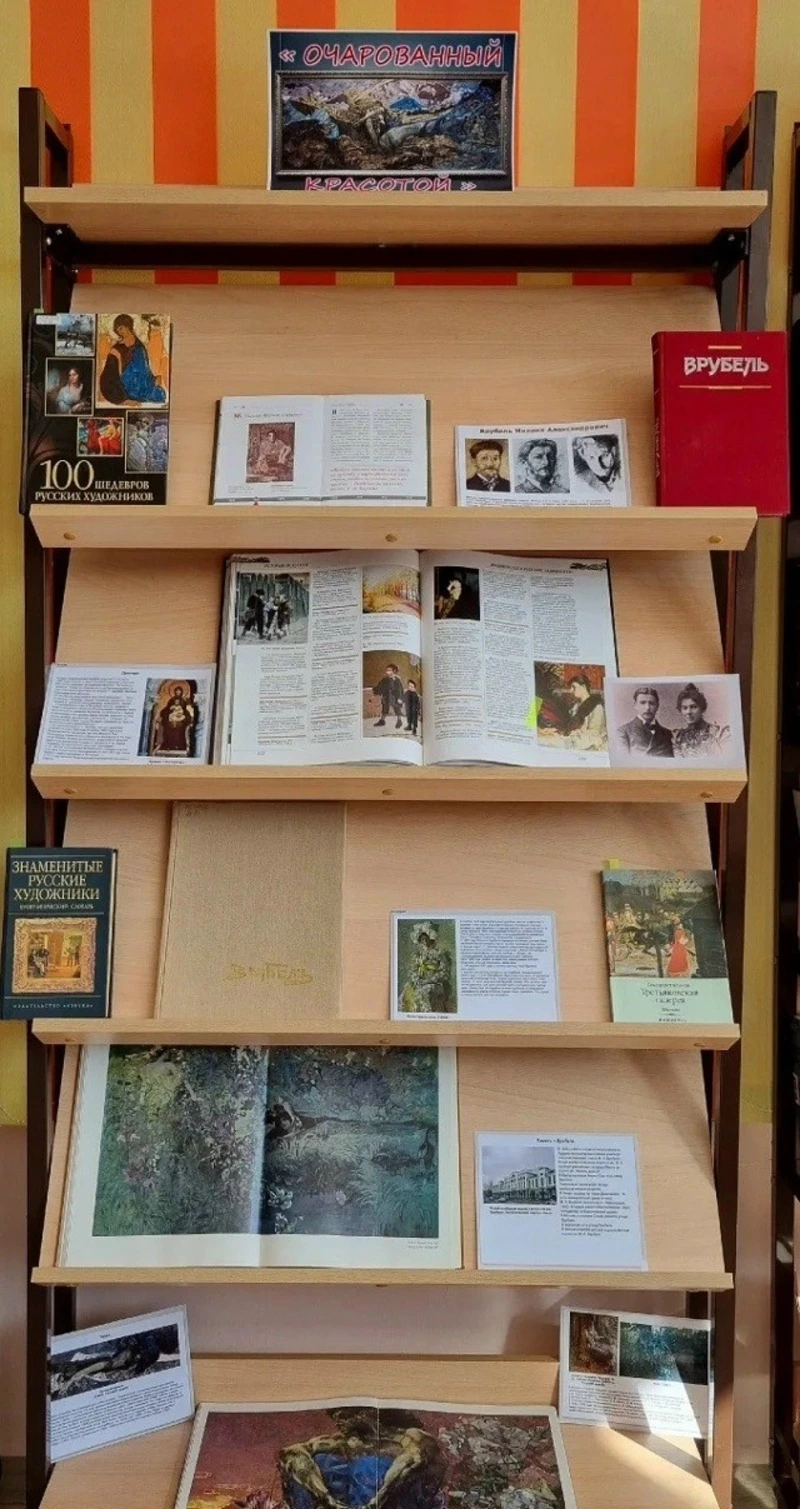 К юбилею выдающегося художника сотрудниками Центральной библиотеки города подготовлена книжная выставка «Очарованный красотой». В неё вошли издания о жизненном и творческом пути художника и альбомы полотен Врубеля, не только собрание живописи, но и произведений скульптуры, графики и иллюстраций к литературным произведениям.